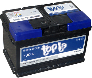 Аккумулятор TOPLA ENERGY произведён по так называемой "малообслуживаемой" технологии( имеет минимальный показатель потери уровня воды). Корпус батареи не имеет крышек для проверки уровня и плотности электролита. Батарея выполнена по технологии Ca/Ca.